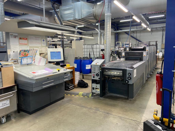 Alcolor automatic Film Dampening<>Autoplate (semi-automatic plate loader)<>CP 2000 Control Center<>Preset - automatic size device<>Coater<>Chambered doctor blades<>Automatic blanket, roller and impression-cylinder washing device<>Powder sprayer<>Plate punch<>Plate bender