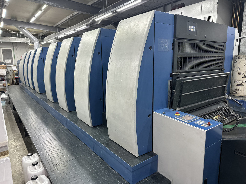 | Description: | Mod. Rapida 106-8 SW SPC<>Antistatic equipment feeder and delivery, high-performance<>version<>SIS – Sensoric Infeed System, without mechanical side lay<>system<>Pneumatic plate bending device at the gallery<>DriveTronic SPC - Simultaneous Plate Change incl. paper<>stretch compensation<>DriveTronic Plate Ident<>Inking unit temperature control without ink duct roller<>cooling, incl.<>Technotrans Beta C High tech combi cooling unit<>CleanTronic - Multi-purpose washing system for blankets and<>impression cylinders & roller washing system for conventional<>inks<>1x Winding stand incl. supply reel, motorized<>4 set Additional washing cloth spindle<>Nonstop rollers for uninterrupted production on delivery<>Powder removal (Koenig & Bauer)<>EES - Emission Extraction System<>Dynamic sheet brake with four speed – compensated suction<>belts<>Package water-cooling for combi cooling unit and air supply<>cabinet (Technotrans)<>Booster for water cooling in case of temperatures above 35°C<>up to 40°C (Technotrans)<>Wallscreen for visualisation of all press processes<>ErgoTronic ColorControl - Automatic ink density<>measurement along x and y axis at the ErgoTronic console<>QualiTronic ColorControl (perfecting) - Inline ink density<>measurement<>ErgoTronic ICR - Integrated Camera Register, automatic<>register measurement at the ErgoTronic console<>LogoTronic CIPLinkX<>Digital speed display<>PWVA Plate change<>INTERCOM |