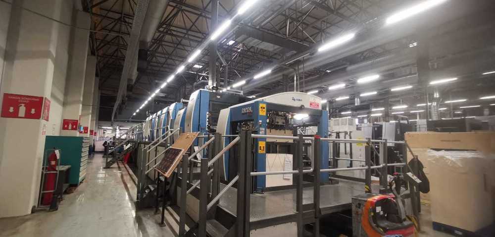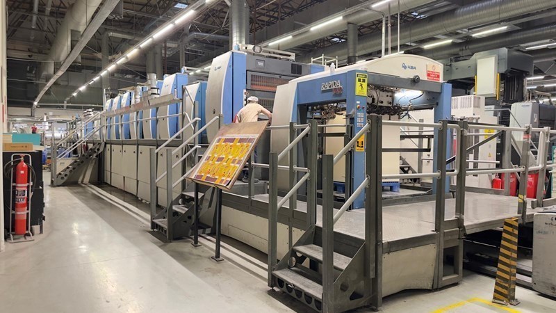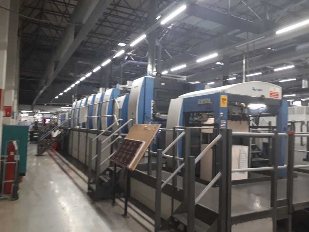 | Description: | Mod. RA142-1+T-6+L ALV3 HYBRID<>7 Colour with Coating<>Raised Machine: High Raised 420mm<>CX Package for Microflute and Heavy Board (up to 1.6mm)<>Hybrid Technology for Conventional and UV Printing<>SAPC Plate Change<>Colortronic Remote Inking<>Densitronic-S<>ACR-Control<>CIPLink<>Anilox coater<>Extended Delivery 3,900mm (ALV3)<>Interdeck in all Units<>Eltosch IR/TL/UV Drying System in Delivery<>Additional IR/TL/UV-Dryer Tower after 1. Unit<>4x moveable UV Casettes<>KBA Nonstop equipment manuell (CX)<>De-electrification KERSTEN high-performance design (feeder, system)<>Additional package "Wash & Print"<>WEKO AP 232<>ACS (Air Cleaning System)<>Non Stop Feeder and Non Stop Delivery<>Sheet flow control cardboard (> 450g / m²) (CX)<>Inking unit temperature control<>Washing device for normal color or UV color<>2 x electromechanical double sheet control (for microwave / thick Cardboard)<>Dust extraction (for cardboard)<>Intercom<>Cardboard sheet guide with mechanical guide bars/blown air for thick cardboard (CX)<>Coating unit with chamber doctor blade (Harris Bruno) and anilox roller<>Motorized anilox roller changing device (crane)<>Varnish / cleaning system (Harris + Bruno) for disp / UV fully automatic.<>S-suction roller for 60g / m² to 1.2mm<>BALDWIN Combiliner 852 high-tech cooling combination device<>IPASONIC, AMX and filter unit, with air cooling for wet and dry offset<>Eltosch Dryer IRK6-V3+TL11-V3+KL+00/UVSKW(160/SL)DS0/3+KWL<>Colortronic (Register, Dampening and Ink Remote System Control)<>anilox coater |