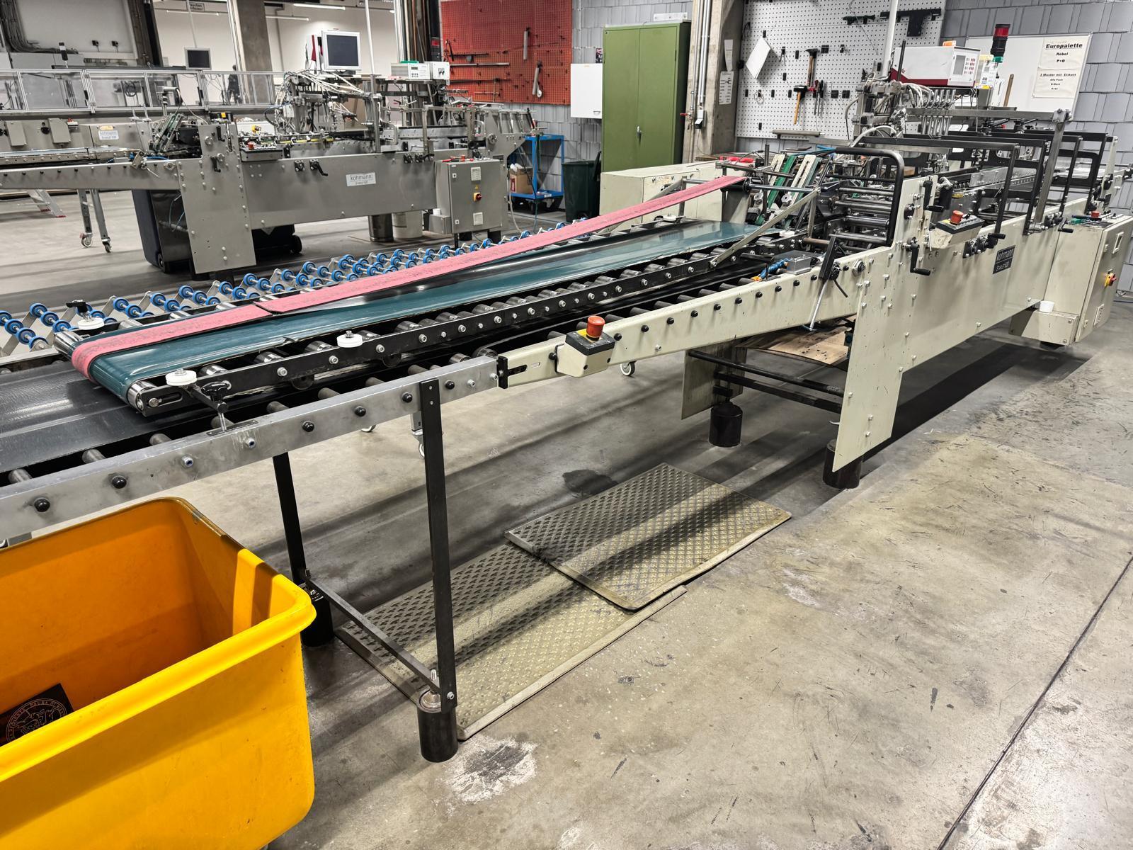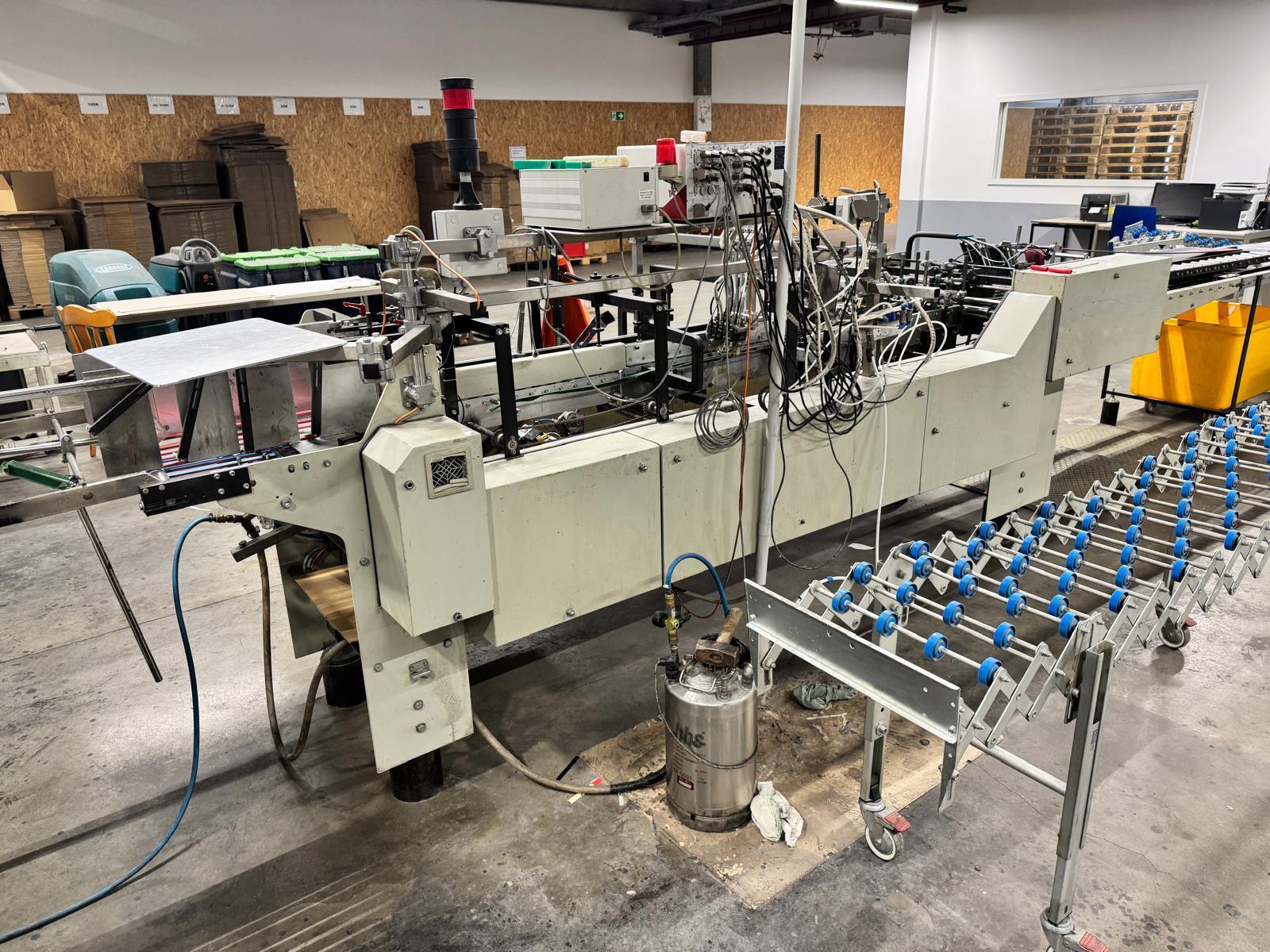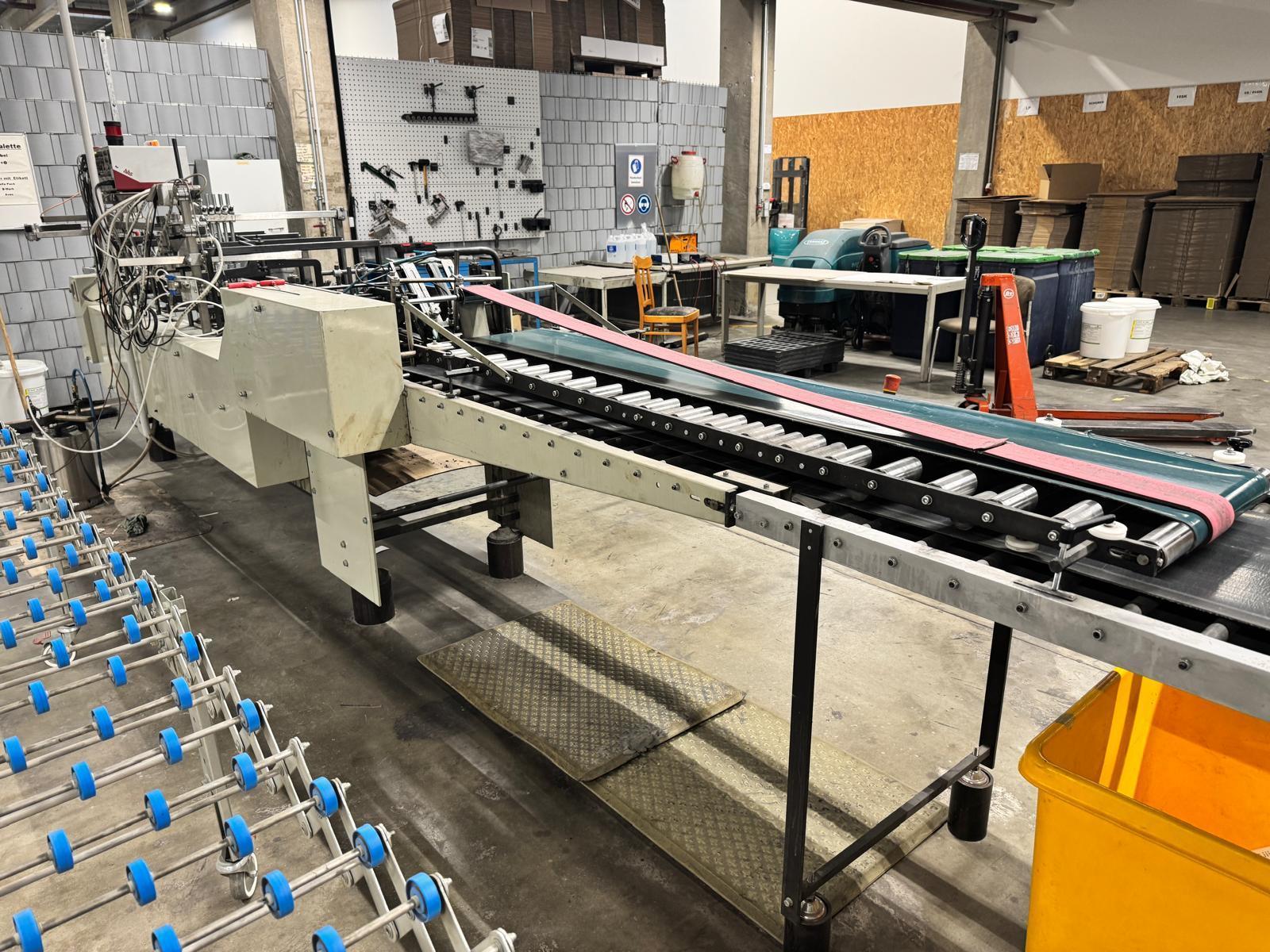 Feeder with vibrating device<>Infinitely adjustable distance between carton blanks<>Pre-breaking crease 1+3<>Bottom disc glue unit<>Electronic counter with digital display, including preset counter<>Delivery with kick-out device<>HHS C-420 glue system <>Drying and press section synchronised with machine speed, can be controlled separately<>Belt speed 150 m/min<>Max open blank width : 620 mm