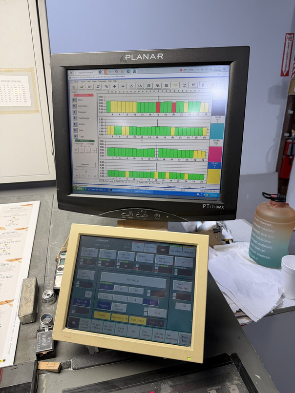 | Description: | PDC-S II Print Density Control Spectrophotometer<>Technotrans Beta C chill unit for roller and dampening<>Baldwin GS4 IR dryer with hot air knives<>KMS-IV management system<>PQC-S print quality control<>AMR preset device for sheet size + thickness<>Automatic blanket, roller and impression-cylinder washing device<>SAPC Semi-automatic plate change<>Grafix powder sprayer<>anilox coater |
