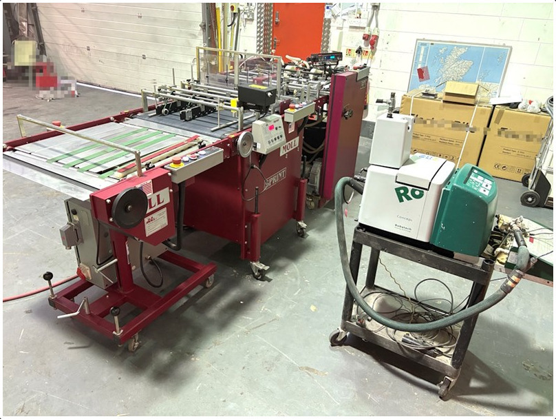 | Description: | Especially for the production of box covers, capacity files and other expandable products. Able to produce capacity folders of many styles from 1/16” to 3/4” (3 – 19 mm) thickness. Low use unit in excellent condition!<>Comprising:-<>‘Dial-a-Feed’ pile suction feeder with programmable counter<>‘Sprint’ – box pocket folder – infeed unit with plow formers to stop plate fold station with spaced rollers.<>Pocket tooling included: 3mm, 4mm, 5mm, 9mm & 10mm.<>‘Sprint’ – electronic controller with various channels for programming.<>Robatech C5/2 hot-melt gluing unit with controller & single glue head.<>Moll 155 Register table/delivery.<>Including accessories and manuals. |
