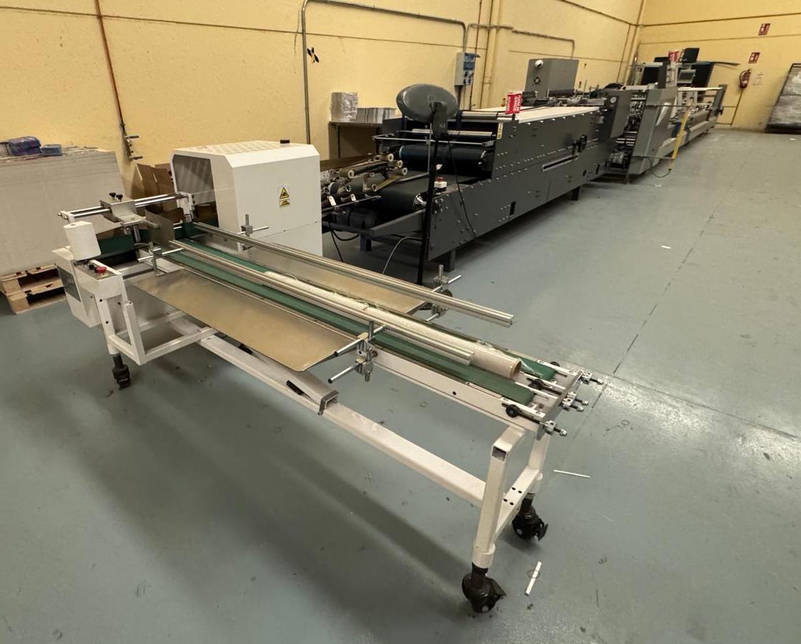 - Flap-printed barcode inspection system, including image inspection, barcode, and QR code verification, enabling contamination control and detection of skewed die-cuts<> - Plasma treatment unit with three guns<>- Double-sided tape applicator <>- Hot melt gluing system with 3 guns<>- 450 output stacker<>Technical specifications:<>- Board capacity: up to 800 g/m²<>- Corrugated board: flute types A, B, E<>- Maximum speed: 400 m/min<>- Slow speed: 10 m/min<>- Maximum folded box thickness: 12 mm<>- Material width: 1100 mm<>- Power consumption: 31.2 kW<>- Air pressure: 6 bar<>- Compressor capacity: 10 m³/h<>- Air tank volume: 60 L<>- Dimensions (L × W × H, depending on configuration): 15,000 × 1,600 × 1,660 mm<>- Net weight (depending on configuration): 7.6 T