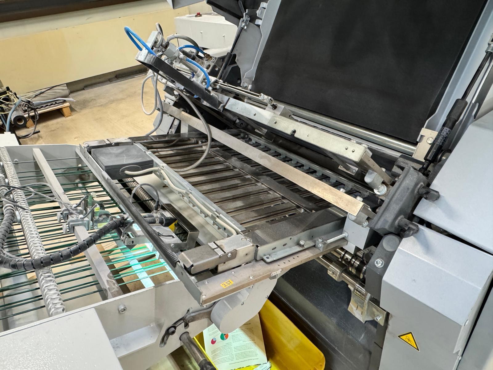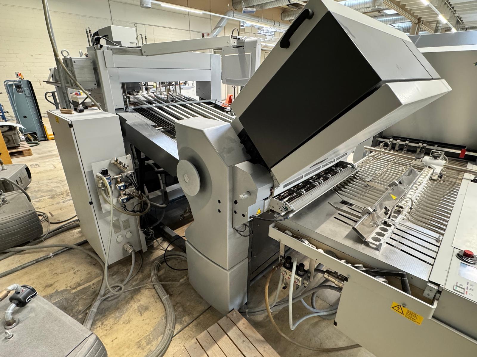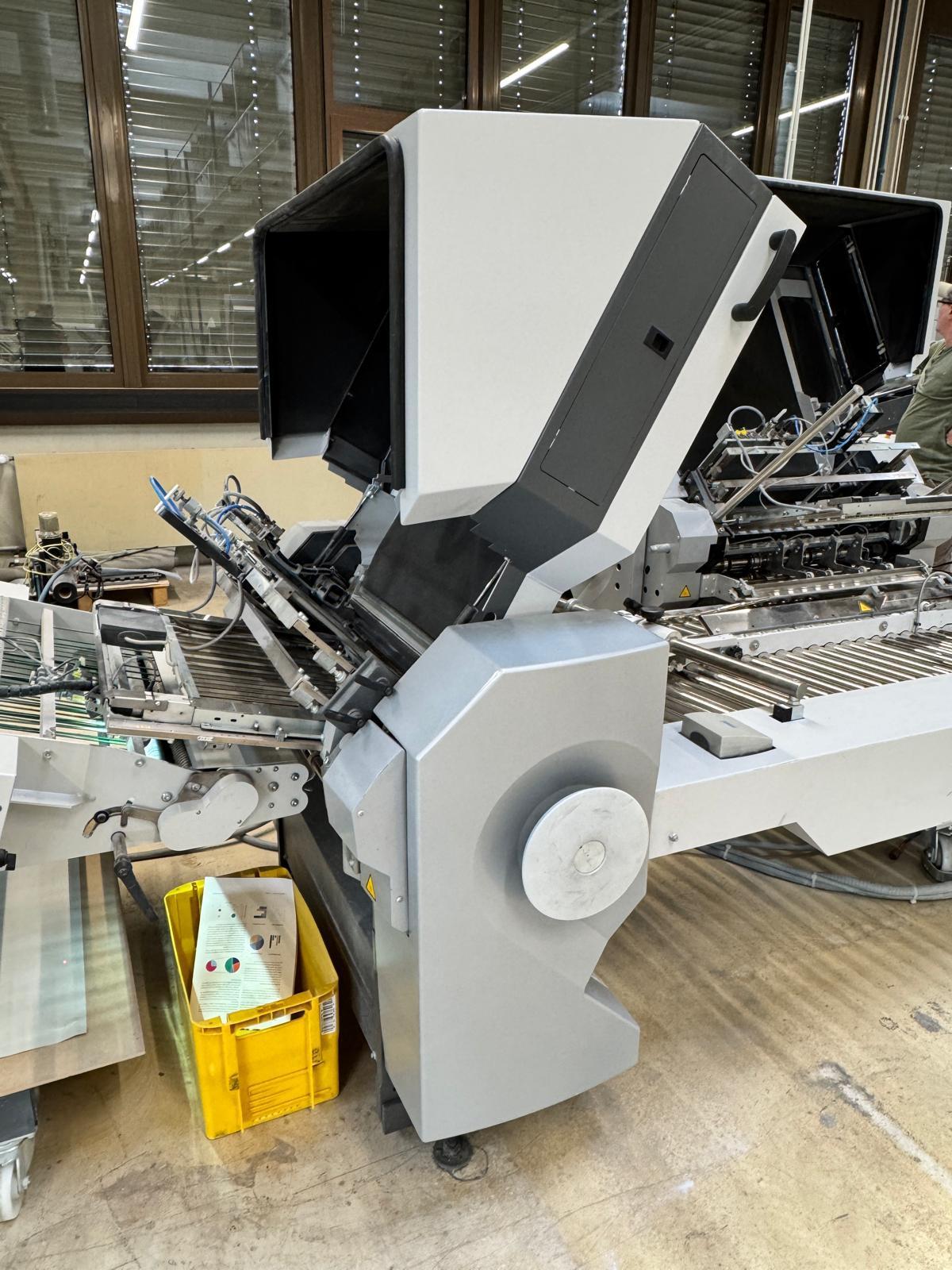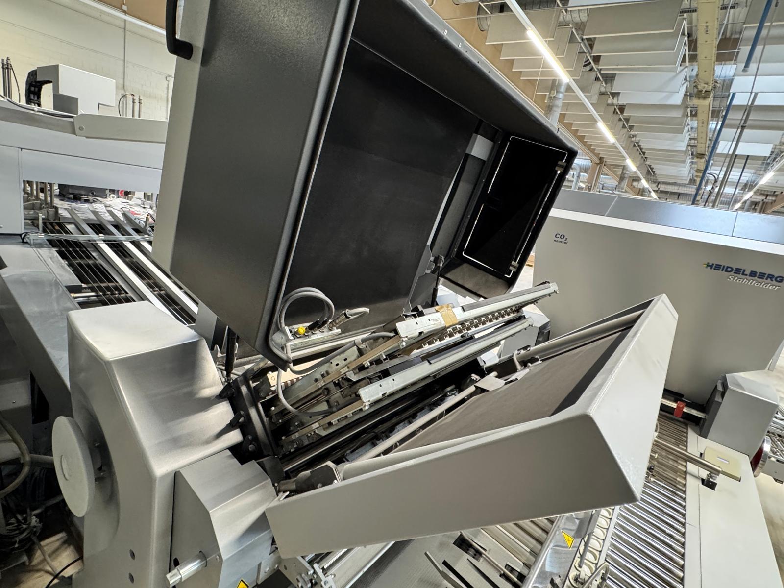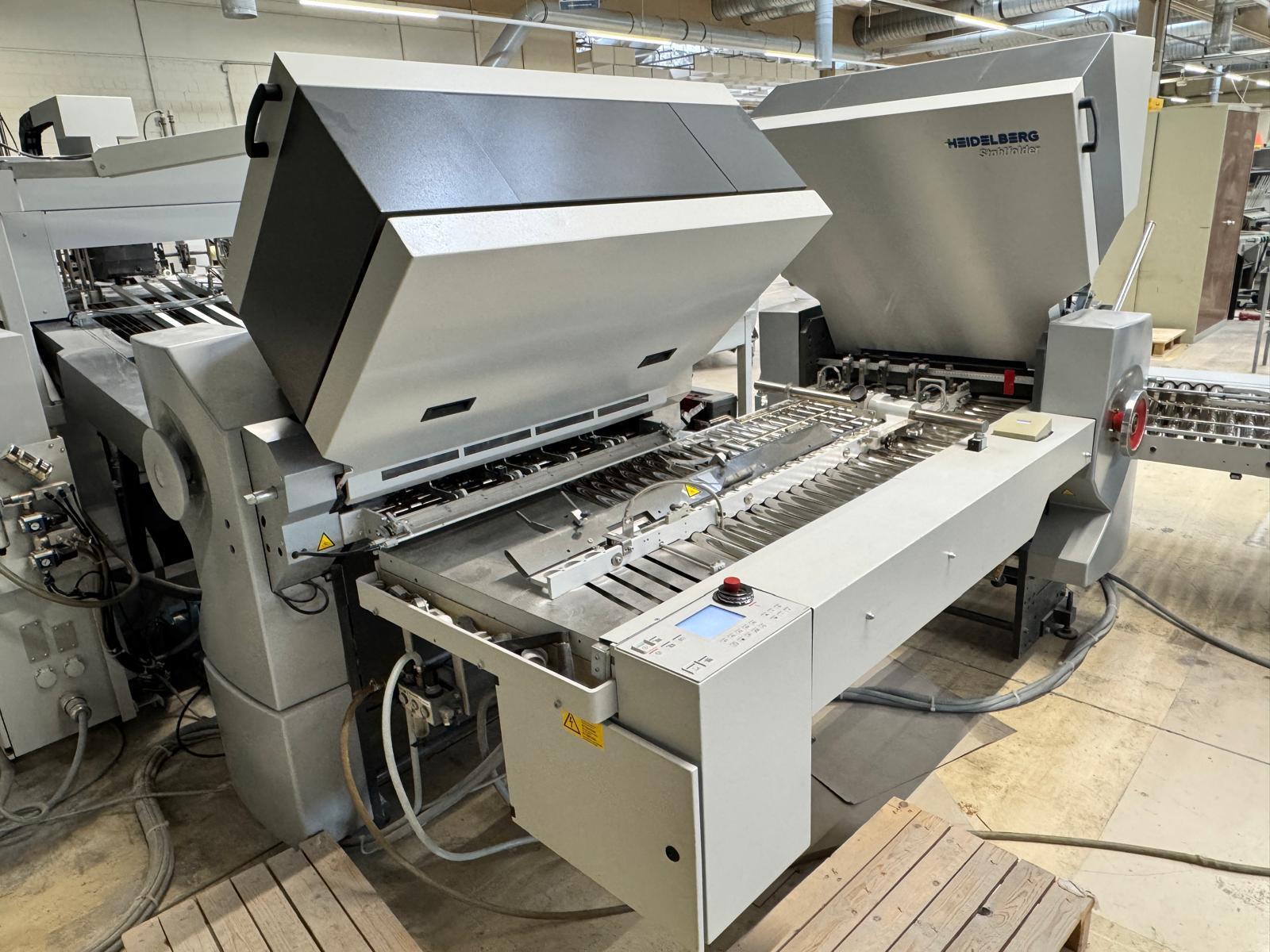 Stahlfolder TH 82-P sets new standards in industrial signature production. Thanks to the innovative shingled folding principle, you can increase your output by over 50% - and improve folding quality at the same time. The automated Push to Stop processes ensure a constant, predictable net output across all print runs. <>Globally unique shingled folding principle<>The folded sheets are not fed individually with sheet spacing, but shingled, meaning overlapping. This reduces the effective infeed length<>Fully automatic pocket folding machine<>1. Station 6 automatic pockets BUX 82-- folding unit -- 82 cm, 2018<>Slitting and Scoring Shafts with Automation Kit II<>PM Press modul<>2. Station is possible for 4 automatic pockets BUX-66 – folding unit – 66 cm, 2018<>Slitting and Scoring Shafts with Automation Kit II<>PM Press modul<>3. Station is possible for 4 automatic pockets BUX-66 – folding unit – 66 cm, 2018<>Slitting and Scoring Shafts,<>vacuum pumps<>Sound hoods<>Heidelberg PFX-82 Pallet feeder with Automation KIT<>MCT Touch screen monitor<>Palamides Alpha 700 HD stacker delivery (2018)<>Including Push to Stop software for Folder and Stacker delivery
