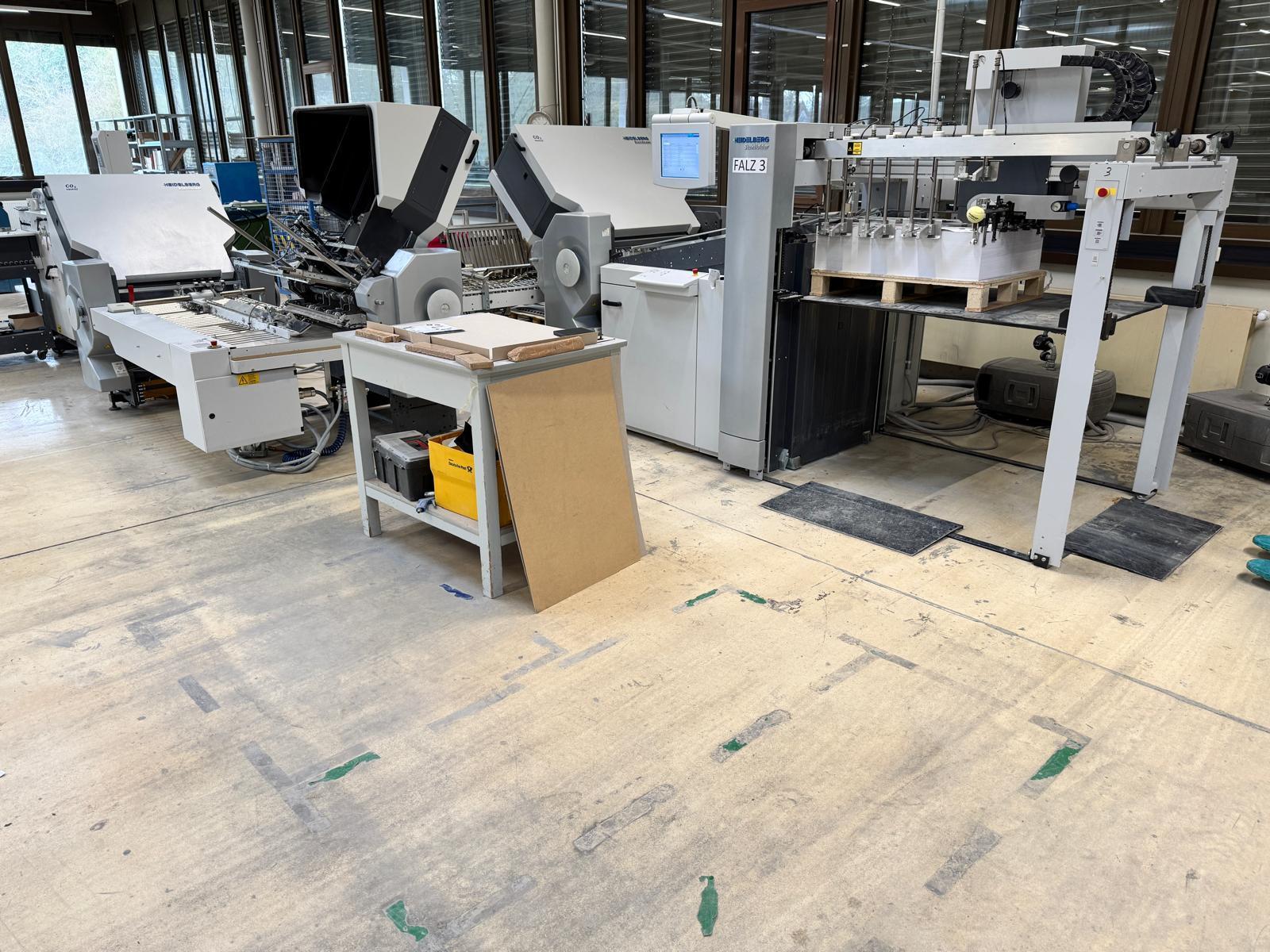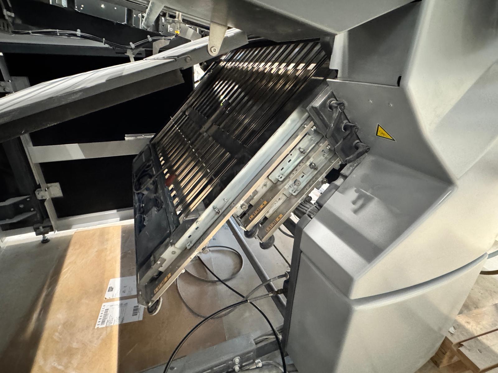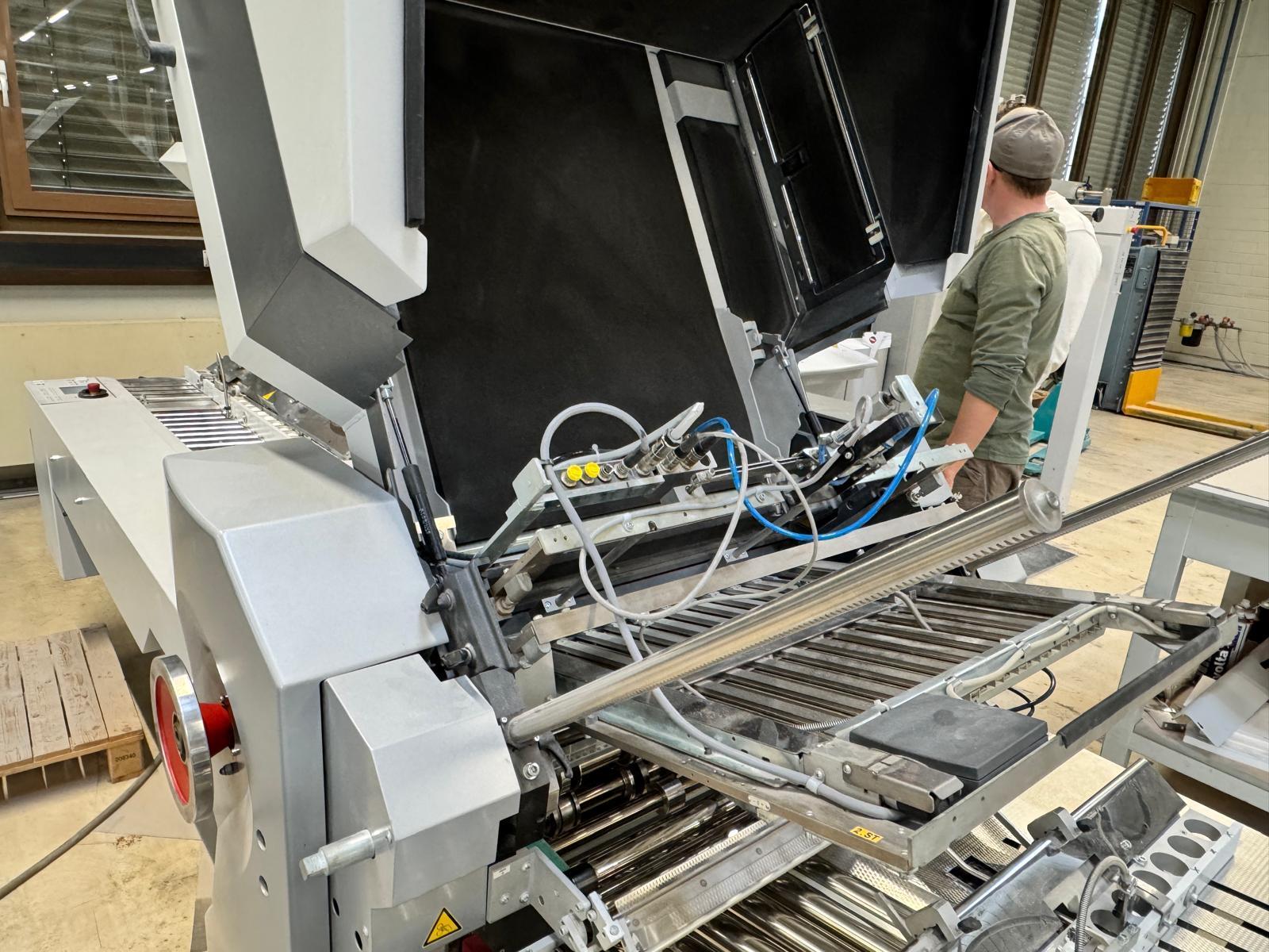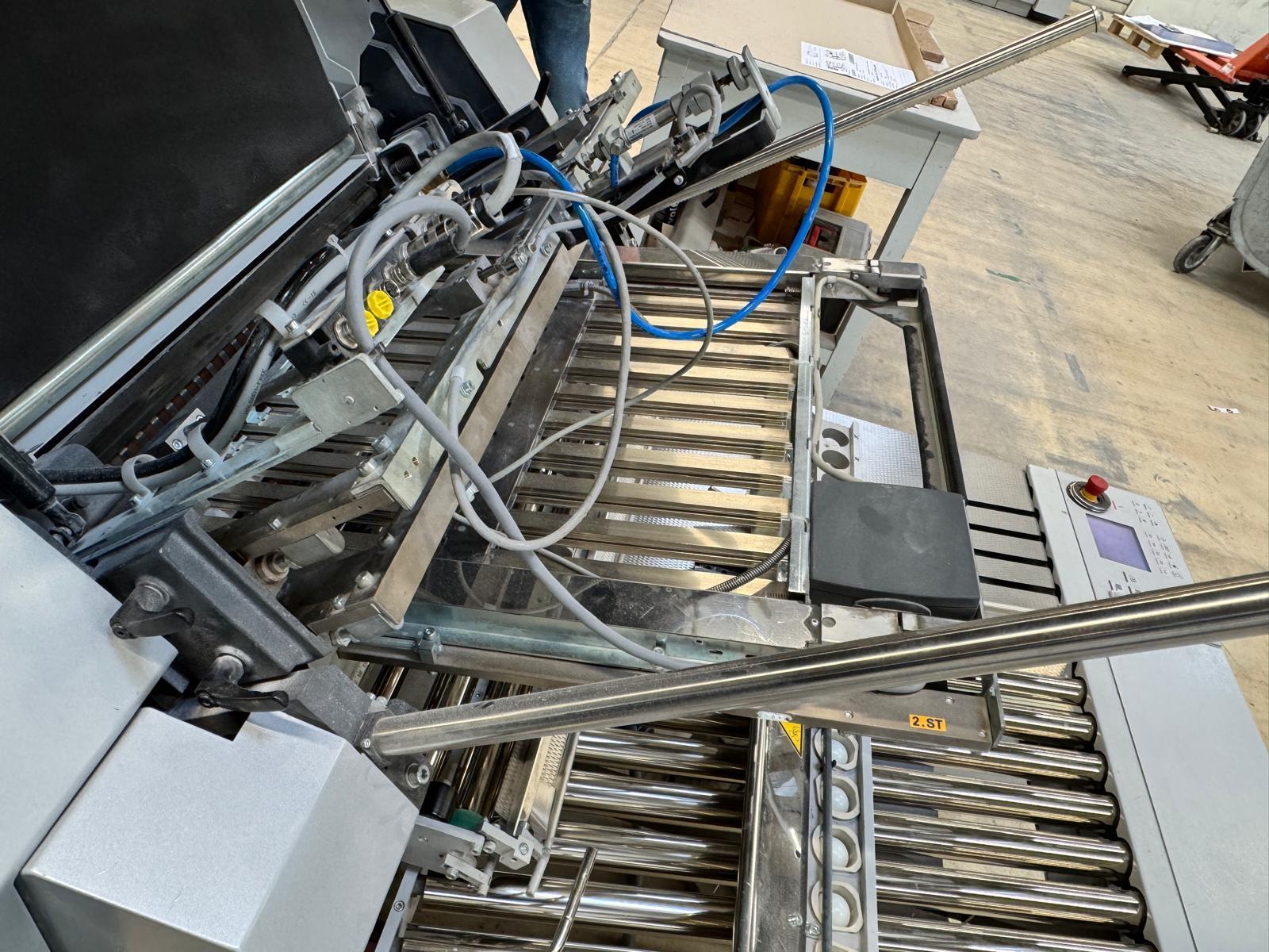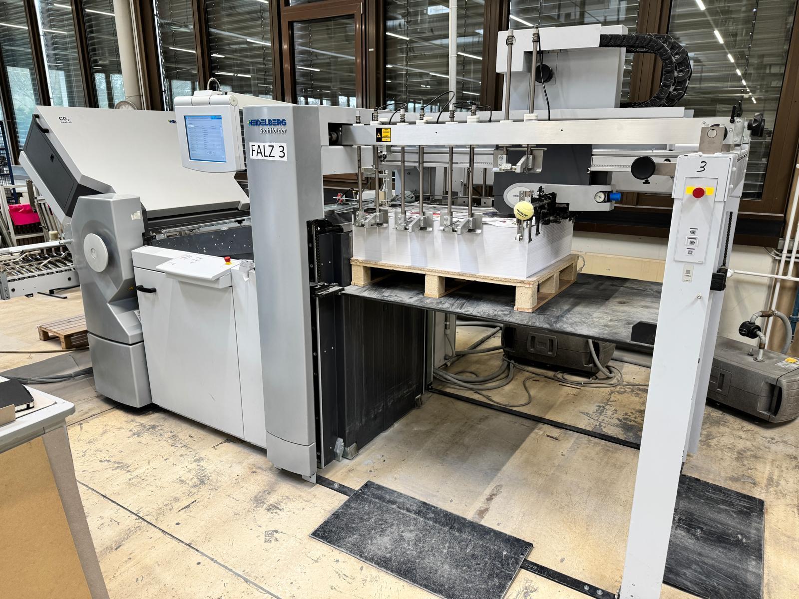 Stahlfolder TH 82-P sets new standards in industrial signature production. Thanks to the innovative shingled folding principle, you can increase your output by over 50% - and improve folding quality at the same time. The automated Push to Stop processes ensure a constant, predictable net output across all print runs. <>Globally unique shingled folding principle<>The folded sheets are not fed individually with sheet spacing, but shingled, meaning overlapping. This reduces the effective infeed length<>Fully automatic pocket folding machine<>1. Station 6 automatic pockets BUX 82-- folding unit -- 82 cm, 2018<>Slitting and Scoring Shafts with Automation Kit II<>PM Press modul<>2. Station is possible for 4 automatic pockets BUX-66 – folding unit – 66 cm, 2018<>Slitting and Scoring Shafts with Automation Kit II<>PM Press modul<>3. Station is possible for 4 automatic pockets BUX-66 – folding unit – 66 cm, 2018<>Slitting and Scoring Shafts,<>vacuum pumps<>Sound hoods<>Heidelberg PFX-82 Pallet feeder with Automation KIT<>MCT Touch screen monitor<>Palamides Alpha 700 HD stacker delivery (2018)<>Including Push to Stop software for Folder and Stacker delivery