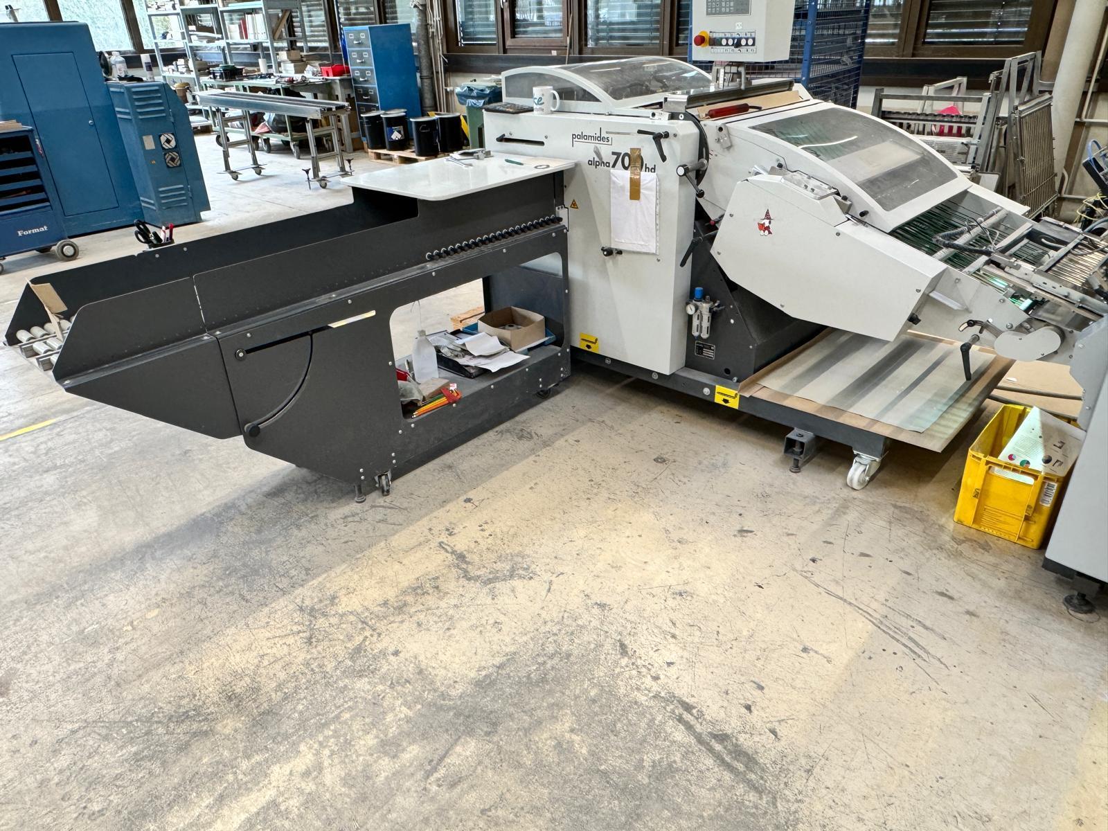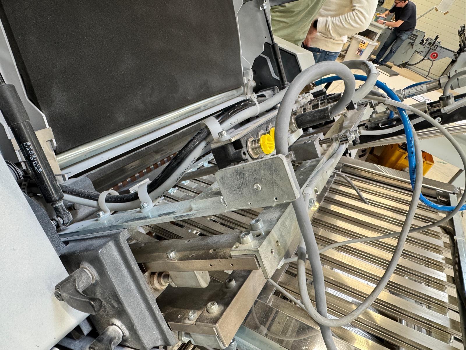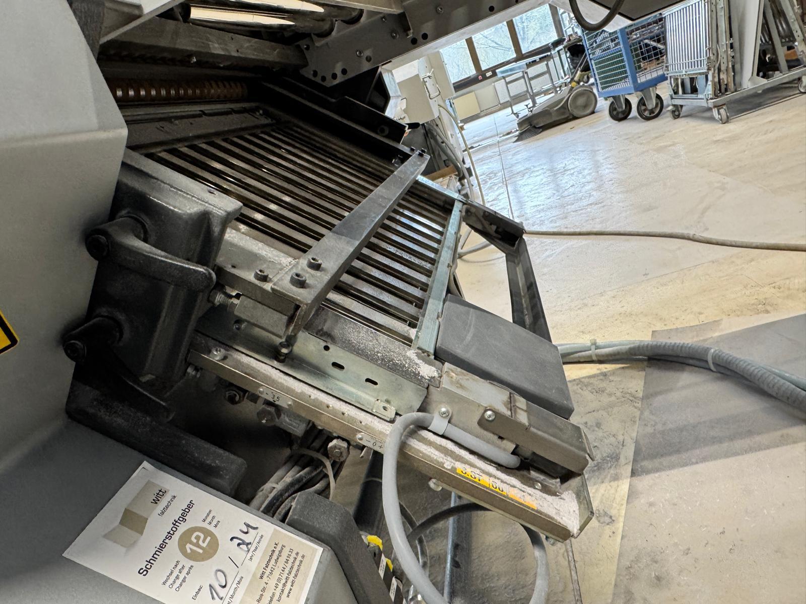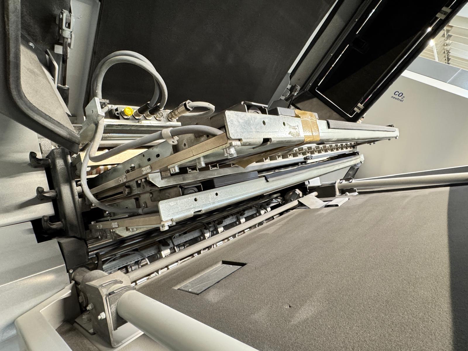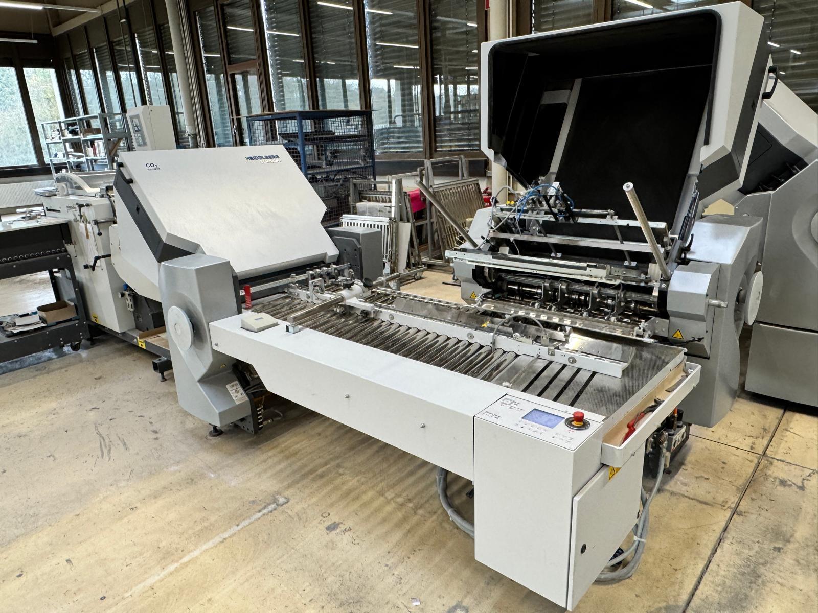 Stahlfolder TH 82-P sets new standards in industrial signature production. Thanks to the innovative shingled folding principle, you can increase your output by over 50% - and improve folding quality at the same time. The automated Push to Stop processes ensure a constant, predictable net output across all print runs. <>Globally unique shingled folding principle<>The folded sheets are not fed individually with sheet spacing, but shingled, meaning overlapping. This reduces the effective infeed length<>Fully automatic pocket folding machine<>1. Station 6 automatic pockets BUX 82-- folding unit -- 82 cm, 2018<>Slitting and Scoring Shafts with Automation Kit II<>PM Press modul<>2. Station is possible for 4 automatic pockets BUX-66 – folding unit – 66 cm, 2018<>Slitting and Scoring Shafts with Automation Kit II<>PM Press modul<>3. Station is possible for 4 automatic pockets BUX-66 – folding unit – 66 cm, 2018<>Slitting and Scoring Shafts,<>vacuum pumps<>Sound hoods<>Heidelberg PFX-82 Pallet feeder with Automation KIT<>MCT Touch screen monitor<>Palamides Alpha 700 HD stacker delivery (2018)<>Including Push to Stop software for Folder and Stacker delivery